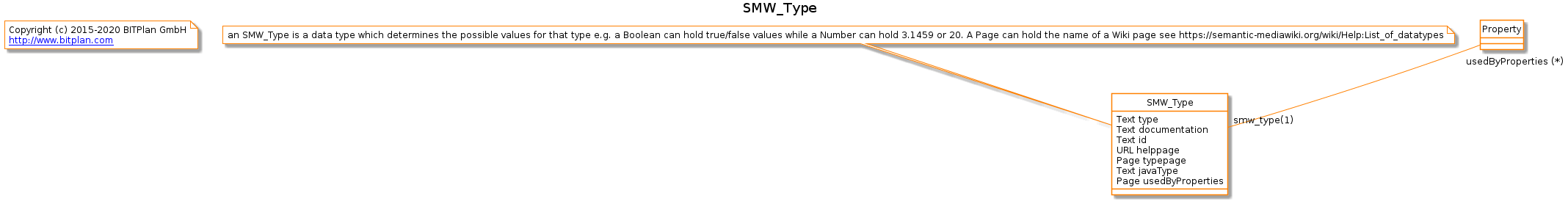 | documentation | an SMW_Type is a data type which determines the possible values for that type e.g. a Boolean can hold true/false values while a Number can hold 3.1459 or 20. A Page can hold the name of a Wiki page see https://semantic-mediawiki.org/wiki/Help:List_of_datatypes |