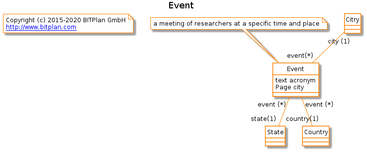 Event "event (*)" -- "country(1)" Country | Event "event (*)" -- "country(1)" Country | ||